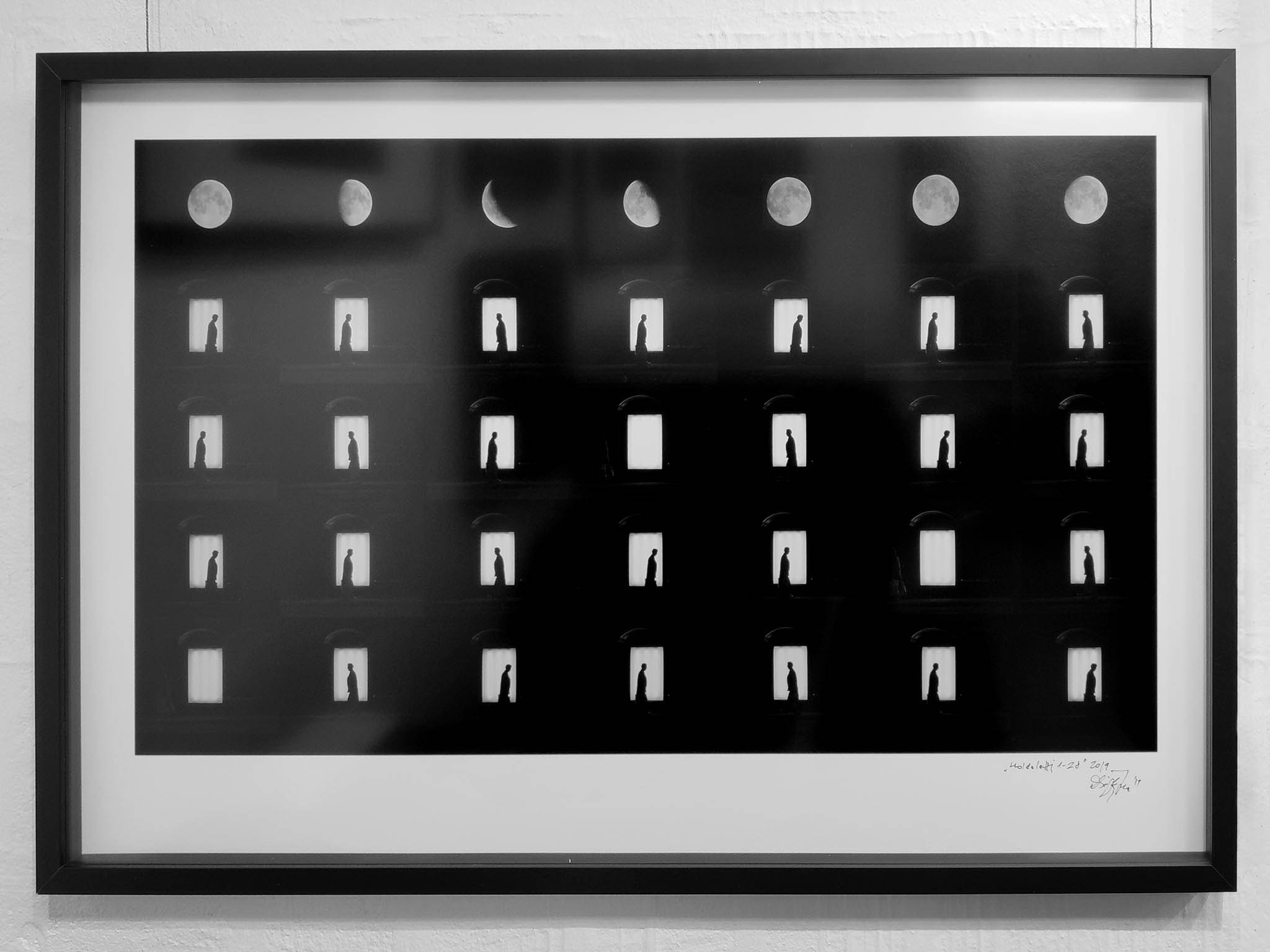 Under the Moon - photography by Imre Drégely. Black and white photo print on archival baryta photo paper, in box frame.